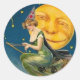 A very pretty witch is flying past a large Harvest Moon on her broom. There is an owl on the broom with her. She appears to be dressed in colourful party clothes and a very not traditional hat for a witch. The sky is bright with stars and the moon seems to be admiring the lovely sight before him.