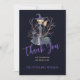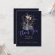Chic elegant Halloween dark midnight blue and purple watercolor typography bridal shower thank you card template featuring a witch in a grey charcoal dress and hat with a broom and brushwood. Suitable for Halloween wicked witch-themed bridal shower. Digital download available.