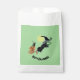 Fun party paper favour bags featuring a colourful original illustration of a witch flying past a full moon on a broom with a black cat and a Jack-o'-Lantern. Lots of Halloween party fun! Green background.