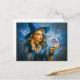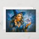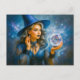 A mystical witch in blue gazes into a glowing crystal ball floating before her. Surrounded by cosmic light and magical atmosphere.