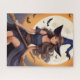 Jigsaw puzzle. A cheerful young witch with long flowing hair rides a broomstick in front of a large, glowing full moon. Bats fly around her, adding to the enchanting nighttime scene.