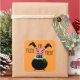 This cute & funny square Halloween sticker features a black pot of green bubbling witch's brew with witch legs upside down in the pot. The background is orange and the text at the top reads: Trick or Treat