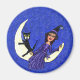 Image from my original painting. This lady witch is dressed in dark purple and is sitting on a crescent moon. Her black cat is joining her and seems to be holding on for dear life. The background is a deep blue night sky with tiny stars.