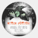 This fun sticker design features a witch with lovely green face and hands, wearing a rumbled black witch's hat and leaning on a recipe card. Text reads 'WITCH POTION / WARNING: MAY CONTAIN BEETLE TOES'. Use as is or change to any text you want using the provided template. Search ID217 to see other products with this design.