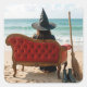 A witch in a wide-brimmed hat sits on a red velvet sofa facing the ocean waves, with a broom and a pair of boots lying on the sand beside her