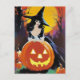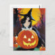 The image shows a woman in a black witch costume leaning on a large pumpkin. The pumpkin is lit up by a candle in the moonlight. The woman has a witch hat on her head. The background is a dark forest with trees and a full moon in the sky. The overall mood of the image is spooky and mysterious.