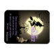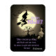 Dark Halloween night with a full moon, flying witch silhouette with bats, a spooky grave with black cats and rats, a raven on top and a dead tree in the distance.