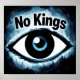 This striking poster centres on a captivating evil eye, painted with a mesmerizing gradient of blues and blacks that draws you in like a modern-day oracle. The eye's gleam is sharp and precise—an emblem of clarity, insight, and vigilance. Above this all-seeing gaze, the commanding phrase “No Kings” challenges the status quo, breaking outdated power structures with a rebellious spirit. The sharp contrast between the deep black text and the illuminated swirl of blues surrounding the eye infuses the design with urgency and dynamism. Finished as a oil paint art print.