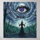 This poster presents a philosophical exploration of power, authority, and perception through the depiction of a large eye suggesting omniscience, reminiscent of the "Eye of Providence." Below, a solitary figure in dark robes represents a witch or sorcerer, commanding a storm, symbolizing a clash between individual will and external forces. The phrase "NO KINGS" rejects hierarchical authority, advocating for decentralized ideals. Artistic contrasts between light and shadow reflect turmoil and the struggle for self-determination, prompting contemplation of who watches, commands, and resists in the context of authority.