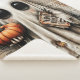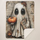 A wide-eyed ghost clutches a tiny pumpkin and a spellbound book titled “Witch Recipe,” floating against a backdrop of vintage newspaper clippings and Halloween headlines. Words like “SPOOK” and “HAUNT” echo through the aged collage, while cobwebs and faded textures weave a whimsical spell. It’s a quiet moment of ghostly curiosity—where magic, mischief, and autumn lore meet.