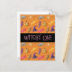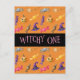 A cute Halloween pattern decorated with witch hats, pumpkins, spiders, witch's brooms, and wrapped candy images. There is a black stripe, on which is written the words, "Witchy One" in pink. Happy Halloween!!
