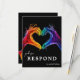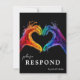 Introducing the RSVP card from the vibrant "Heart of Pride" collection, featuring beautiful artwork on the front. The front caption reads "Please RSVP" along with the response date, inviting guests to confirm their attendance with elegance and inclusivity. The design showcases the iconic "Heart of Pride" artwork—two hands forming a heart gesture in radiant LGBT colours—set against a deep black background, creating a striking and meaningful statement.