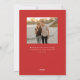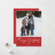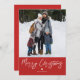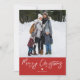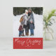 A modern and simple family photo holiday card with custom photo and personalized greeting. The front of the card is red and says "Merry Christmas" in white calligraphy font lettering.