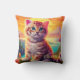 Introducing the purrfect addition to your little one's nursery: a square throw pillow straight out of a fairy tale! Against the backdrop of a breathtaking sunset, hues of pink, gold, and lavender blend together, casting a warm and ethereal glow over the entire landscape. Sitting gracefully at the heart of the pillow is a captivating cat, its fur adorned with striking red and white stripes that stand out against the vibrant scenery. With eyes as green as emeralds, the cat exudes a sense of mischief and wonder, its gaze filled with curiosity and charm.