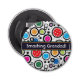 Bottle opener with Colourful pickleballs and black circles on white background. Perfect as a gift for a fashionable pickleball player. Customizable text.
