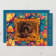 The front of the “Radiant Diwali Blossoms” greeting card is adorned with a vibrant and intricate floral border. The flowers, in shades of orange, yellow, blue, and pink, are stylized with detailed embellishments that evoke the rich traditions of Indian art. These colourful blooms frame a central area designed to hold a custom photo, making the card personal and unique.