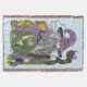 A wizard all in purple holding a staff that has a purple crystal ball. A small green dragon, Celtic knot work, candle and a border of autumn leaves all in a backdrop of light blue