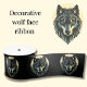 Gift wrapping satin ribbon with a gorgeous tribal wolf face in beige blue on black.