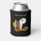 A wolf howling at a full moon with autumn leaves and acorns in a backdrop of black.