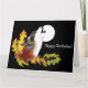 A wolf howling up at a full moon with autumn leaves and acorns against a backdrop of black
