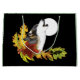 A wolf howling up at a full moon with autumn leaves and acorns in a backdrop of black.