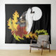 A wolf howling at a full moon with autumn leaves and acorns against a backdrop of black.