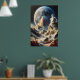 A wolf howls at the moon in a fantastical landscape of snow-capped mountains and glowing orbs. The large, blue moon fills the sky, casting an ethereal glow over the scene.