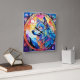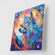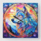 A beautiful wolf with her sights on the mountains and the sunset behind her in stained glass motif.