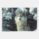 This is a beautiful grey wolf in a background of snow. You can see trees covered with snow. Grey wolves range in colour from grizzled grey or black to all-white. As the ancestor of the domestic dog, the grey wolf resembles German shepherds or malamutes. Though they once nearly disappeared from the lower 48 states, today wolves have returned to the Great Lakes, northern Rockies and Southwestern United States. For additional information about the grey wolf see http://www.defenders.org/grey-wolf/basic-facts