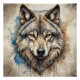 A Wolf with detailed watercolor with expressive eyes is portrayed against a soft, blurred background. The natural colours enhance the lifelike appearance.