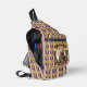 L'oeuvre originale de ZoeSPEAK sur ce Sling Bag présente un portrait du compositeur de musique classique Wolfgang Amadeus Mozart. Le portrait est un ensemble de profil dans un cadre doré ovale orné. Le cadre est accroché sur un papier peint violet arrière - plan avec des grappes dorées de raisins en rangs, et des rayures verticales blanches et lavandes.