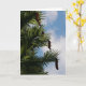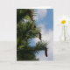 Card with photo of wollemi pine tree with cones against a blue sky with white clouds