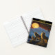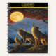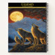 Under a vast starry sky, three wolves stand atop a rocky outcrop, their silhouettes illuminated by the radiant full moon
