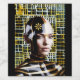 A woman with bald head and futuristic, black-and-gold striped body paint poses in front of a geometric background. She has a decorative yellow flower design on her forehead.