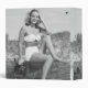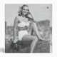Woman wearing bikini sitting on log on beach, (B&W), (Portrait) | George Marks | AssetID: 57416977