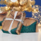 Woman in blue bralette holding sunglasses putting wrapping paper