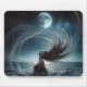 A woman emerges from the ocean, her wet hair creating a dramatic arc against the night sky with a full moon