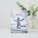 Uplifting series: A great postcard featuring a photo of a woman jumping for joy off some rocks on a beach. Her arms and legs are partially outstretched, turning it into a crab jump. She's wearing a padded jacket against the cold and her hair is lifting in the wind. With a happy expression and eyes wide, the overall impression is of wild exuberance.