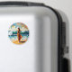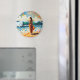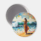 An oceanic themed magnet. A beautiful ai illustration done in an oil painting impasto style. A woman walking on the beach with an abstract mosaic vibrant colourful style.