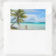 Rectangular photo sticker of a woman in bikinis under a hanging palm tree in the shallow water of the lagoon at the beach of a tropical island in the pacific archipelago French Polynesia.
