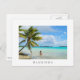 Postcard of a woman in bikinis under a hanging palm tree in the shallow water of the lagoon at the beach of a tropical island in the pacific archipelago French Polynesia with a white border and the text: 'Rangiroa'.