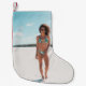 Woman wearing bikini standing on sand small christmas stocking