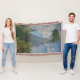 depicts Claude Monet's wife Camille with a parasol, standing on a grassy green hill with a blue cloudy sky in the background, on a windy day in summer