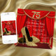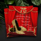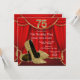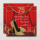 Elegant red and gold glitter high heel shoes woman's stepping into seventy five 75th birthday party invitations with beautiful gold glitter high heel shoes on a red and gold curtain background. This elegant red and gold birthday party invitation is easily customized for your party or event by adding your event details, font style, font size & colour, and wording.