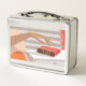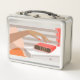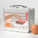 Womans hand pushing on alarm clock snooze button metal lunch box