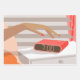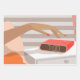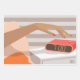Womans hand pushing on alarm clock snooze button wrapping paper sheet