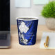 Womans royal blue and silver birthday party paper cups with silver glitter high heel shoes, pearls and balloons on an elegant royal blue satin and silver swirl background. You can add the text of your choice to these pretty royal blue and silver paper cups. You can remove the champagne glass.