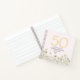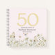 Celebrate in style with this elegant 50th Birthday Party guestbook, designed to remember the big day. The design features a shimmering golden “50” glowing softly in the background. A delicate border of watercolor white wildflowers and green leaves frames the bottom, all set against a soft pink background for a refined, timeless look. The party details are displayed in a crisp white serif font, ensuring easy readability and sophistication. Perfect for family members, this guestbook allows the name to be customized with ease. Thanks for your interest—give this design a like if you love it!