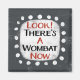 An irreverently weird typographic animal design that says "Look! There's A Wombat Now". It features black and red text on a white rectangle with funky, playful white dots surrounding it, all on a grey background.
