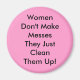 Women Don't Make Messes est un produit humoristique. Cela met en évidence le fait que les femmes ne devraient pas avoir à nettoyer le désordre de quelqu'un d'autre. Malheureusement, beaucoup de femmes peuvent encore comprendre qu'elles sont souvent laissées nettoyer après les autres. Si vous êtes l'une de ces femmes qui peuvent se rapporter à cela, alors vous pouvez apprécier l'humour dans cette déclaration.